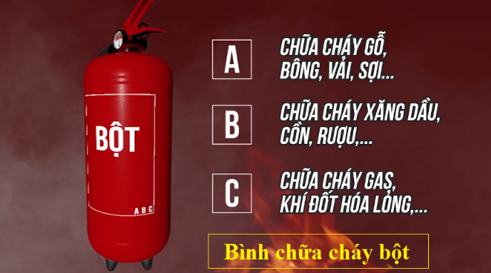 ➤Bình chữa cháy bột là bình bên trong chứa khí nitơ làm lực đẩy để phun bột dập tắt đám cháy. Bột chữa cháy không độc, không dẫn điện. Các chữ cái A B C trên bình thể hiện khả năng dập cháy đối với các đám cháy khác nhau cụ thể