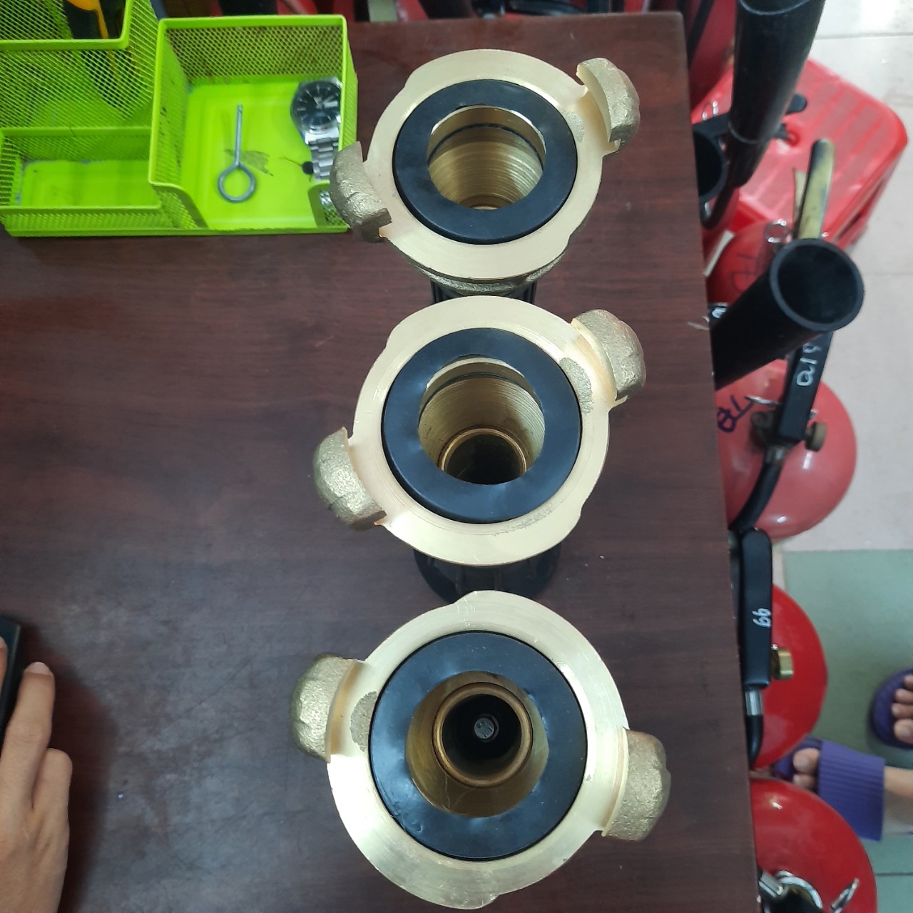 - Kéo cuộn dây cứu hỏa ra, sao cho cuộn dây không bị gấp khúc. Đưa đầu khớp của dây cứu hỏa khác lắp vào khớp nối của dây cứu hỏa trên.